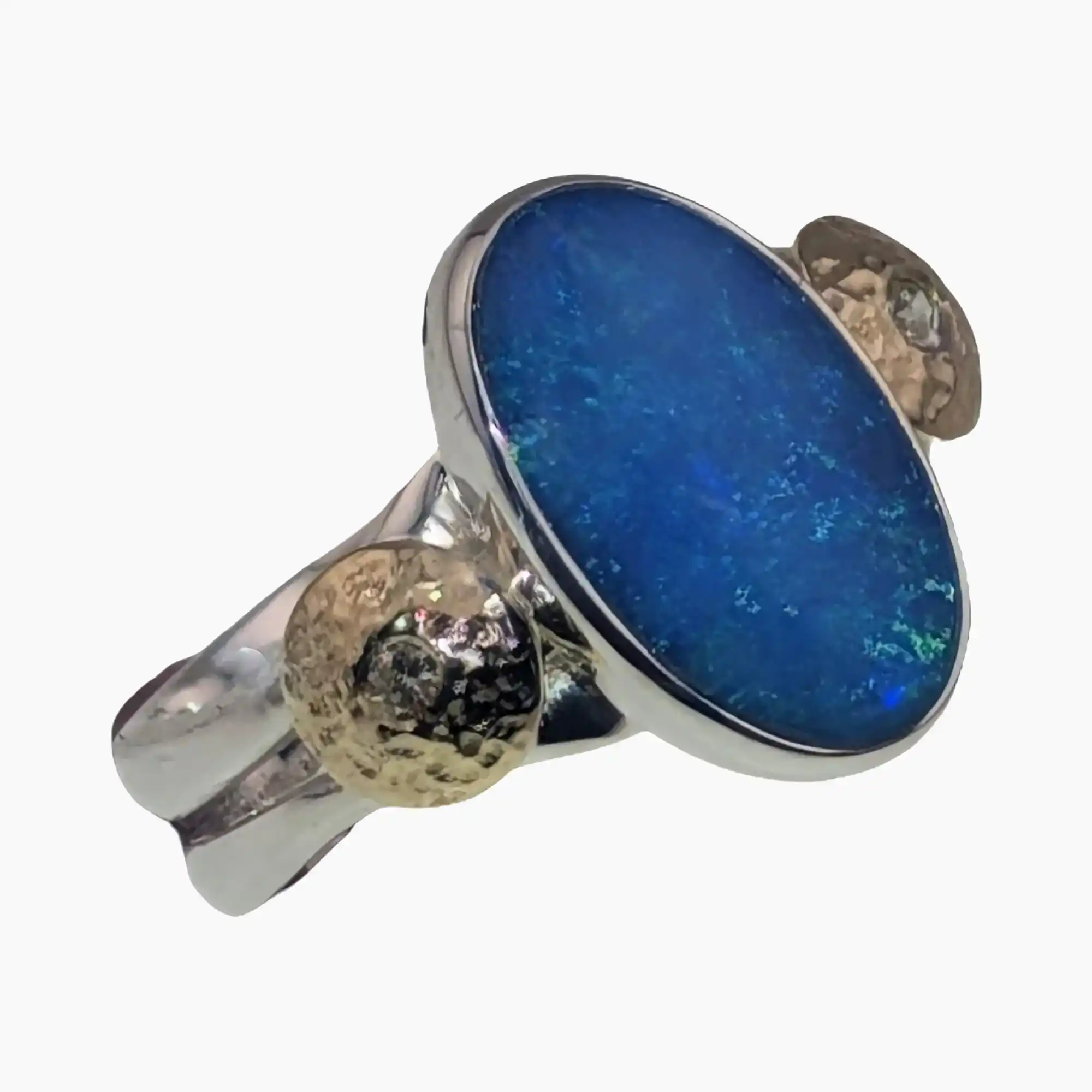 Ring with oval 2.94-carat opal measuring 13.5 x 8mm from Coober Pedy, Australia. Set in sterling silver with solid 18-karat gold accents, flush set with two 1.7mm round 0.04-carat VS1G quality diamonds.. The opal has been selected for its visible character (round, 1.7 mm, 2.94 carat). Set in sterling silver, the profile sits neatly on the hand for daily use. Origin: Australia. Easy to style and straightforward to wear, it suits both everyday outfits and more formal looks.