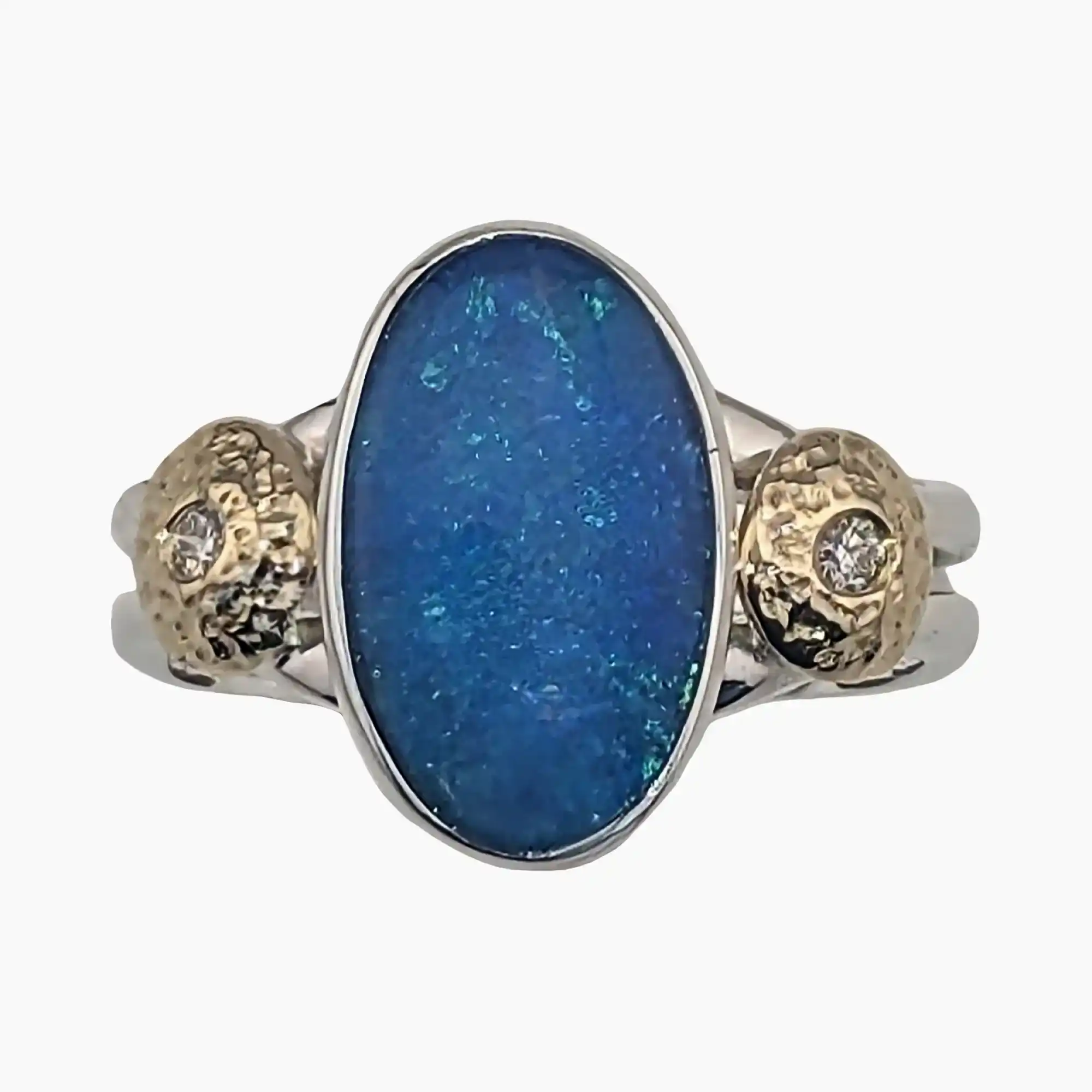 Ring with oval 2.94-carat opal measuring 13.5 x 8mm from Coober Pedy, Australia. Set in sterling silver with solid 18-karat gold accents, flush set with two 1.7mm round 0.04-carat VS1G quality diamonds.